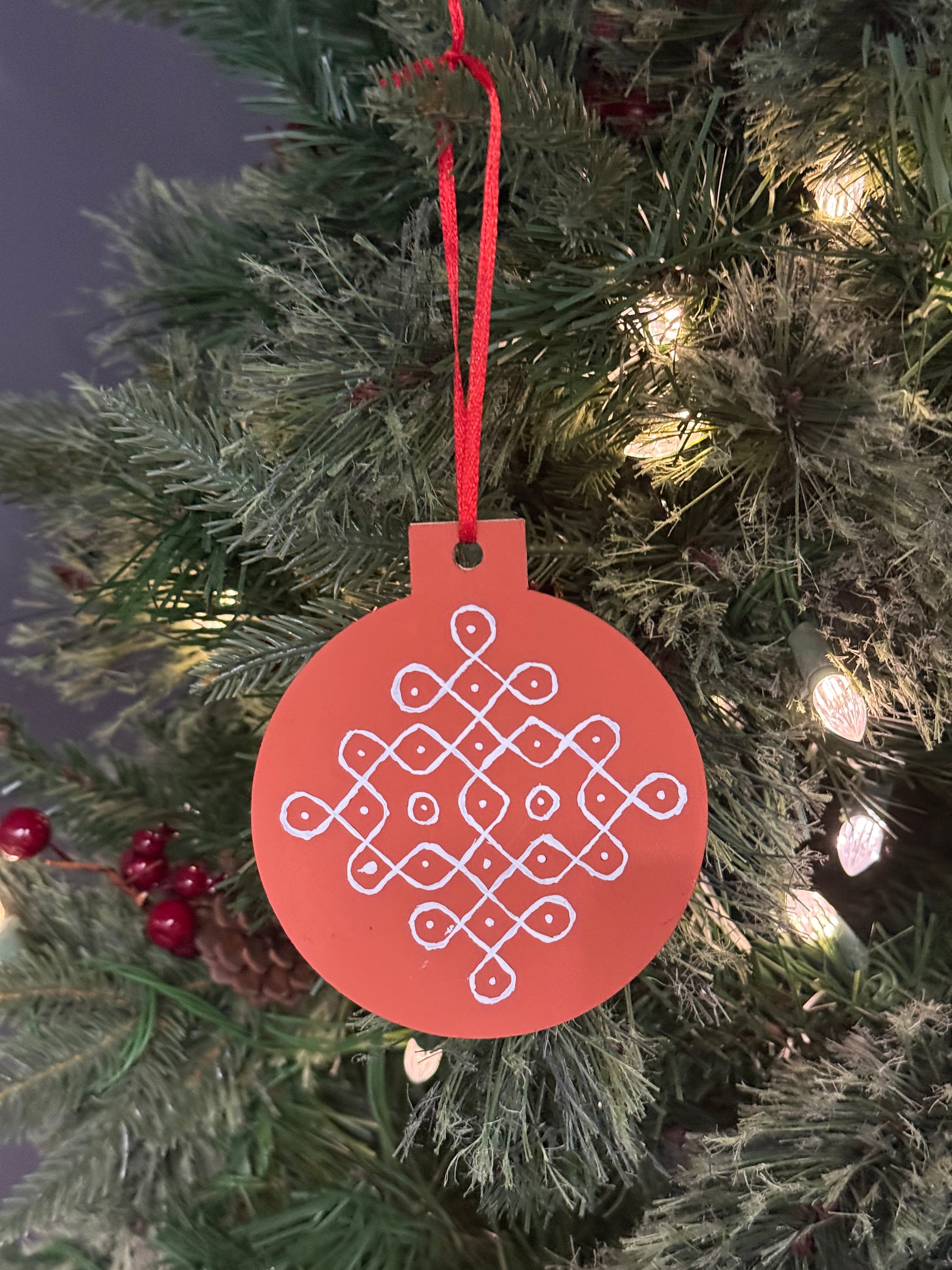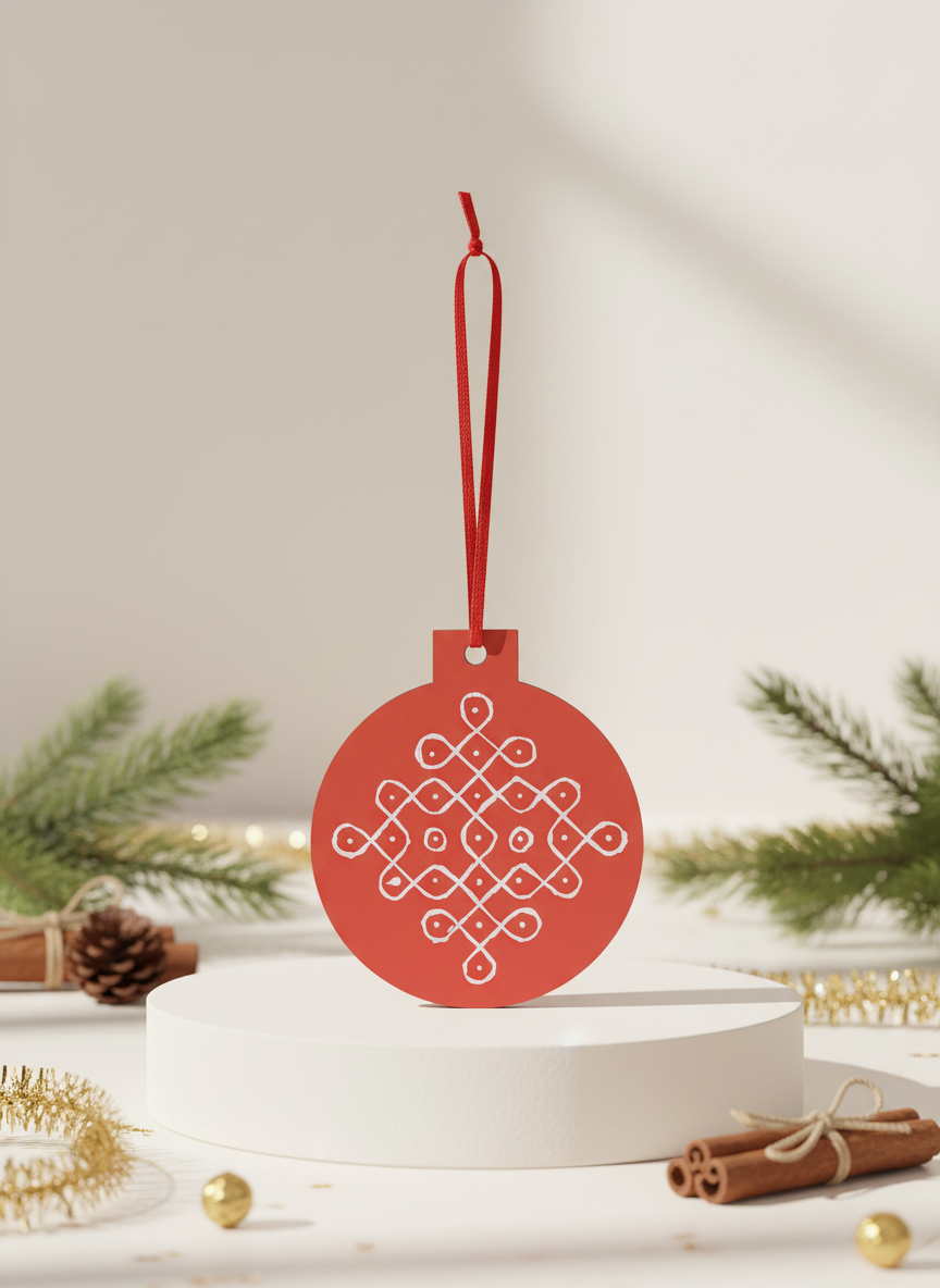 Elevate your holiday decor with our beautifully crafted Kolam Design Ornament. Inspired by the intricate and vibrant patterns of this traditional art form, this ornament adds a unique touch to your Christmas tree. Made with high-quality materials, it features detailed designs that capture the essence of cultural celebration. Perfect for those looking to blend tradition with festive cheer, this ornament not only enhances your holiday decorations but also serves as a meaningful symbol of heritage. Hang it on your tree or use it as a decorative piece in your home. Celebrate the season with this distinctive and elegant ornament.